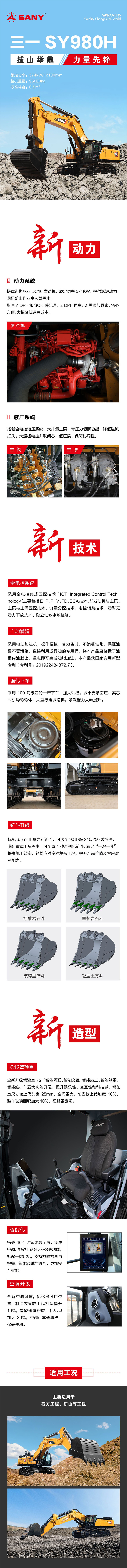 | 性能 | 行走速度:4.3/3.0km/h 爬坡能力:35° 回轉速度:7rpm 接地比壓:132kPa 鏟斗挖掘力:495kN 斗桿挖掘力:469kN |